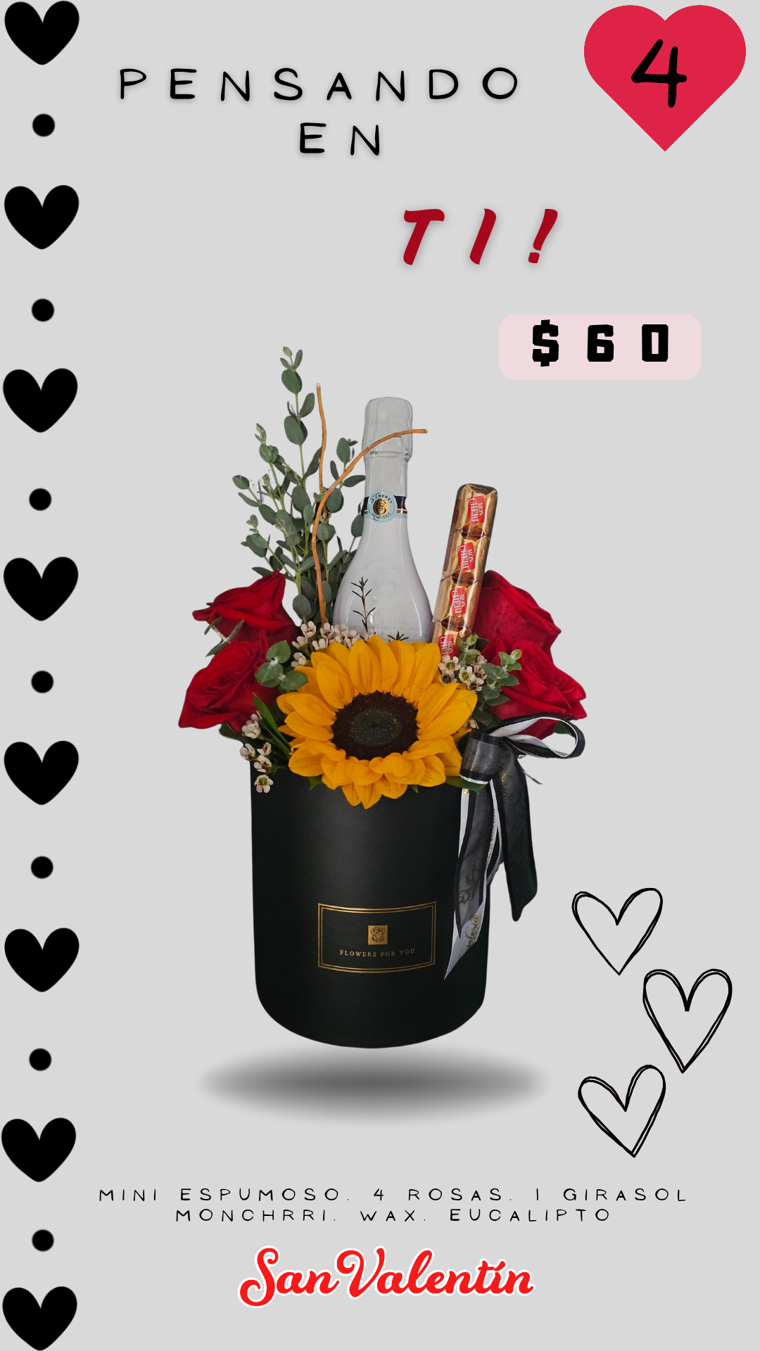 DETALLE IDEAL, COMBINACION PERFECTA! MINI ESPUMOSO (VARIEDAD), 4 ROSAS ROJAS, 1 GIRASOL, EUCALIPTO, Y DELICIOSOS...