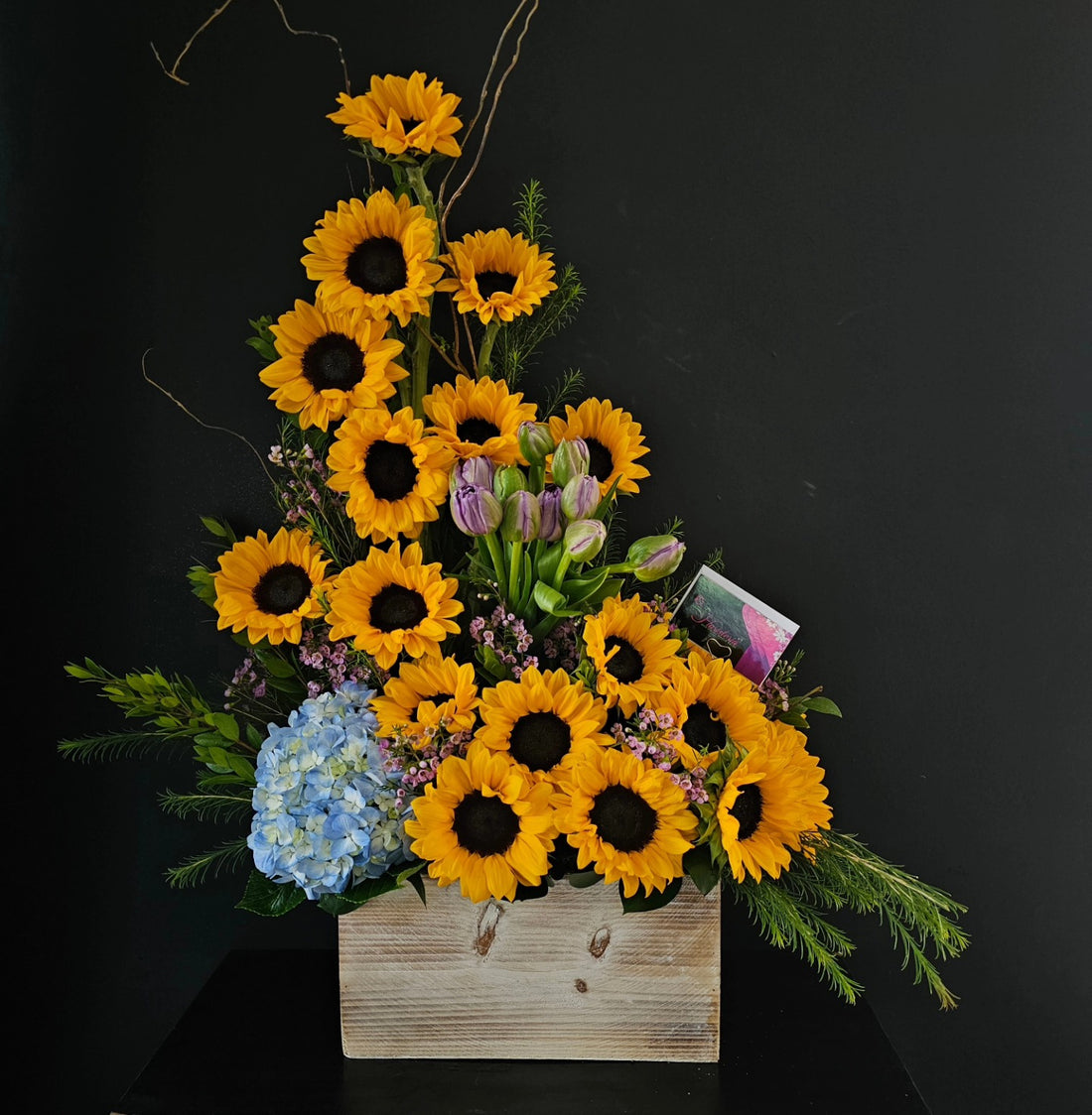 COMBINACION PERFECTA DE GIRASOLES, TULIPANES Y HORTENCIAS