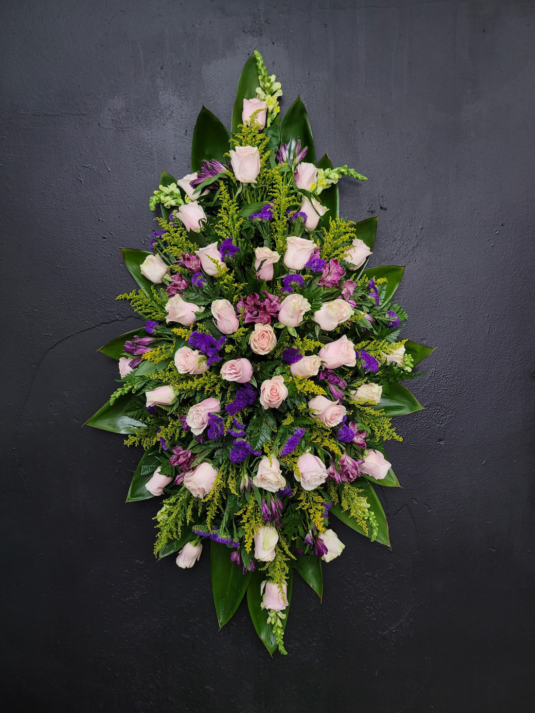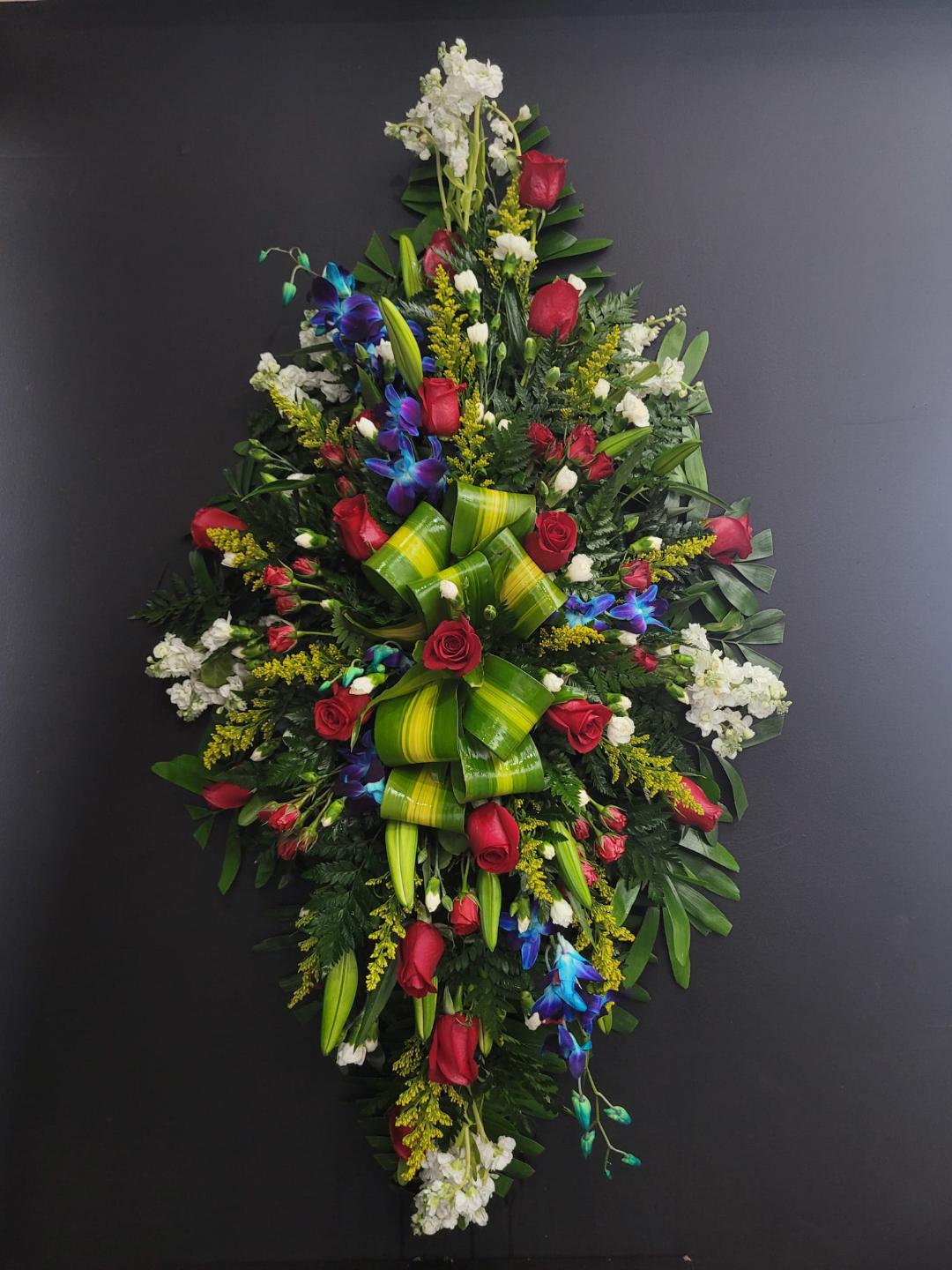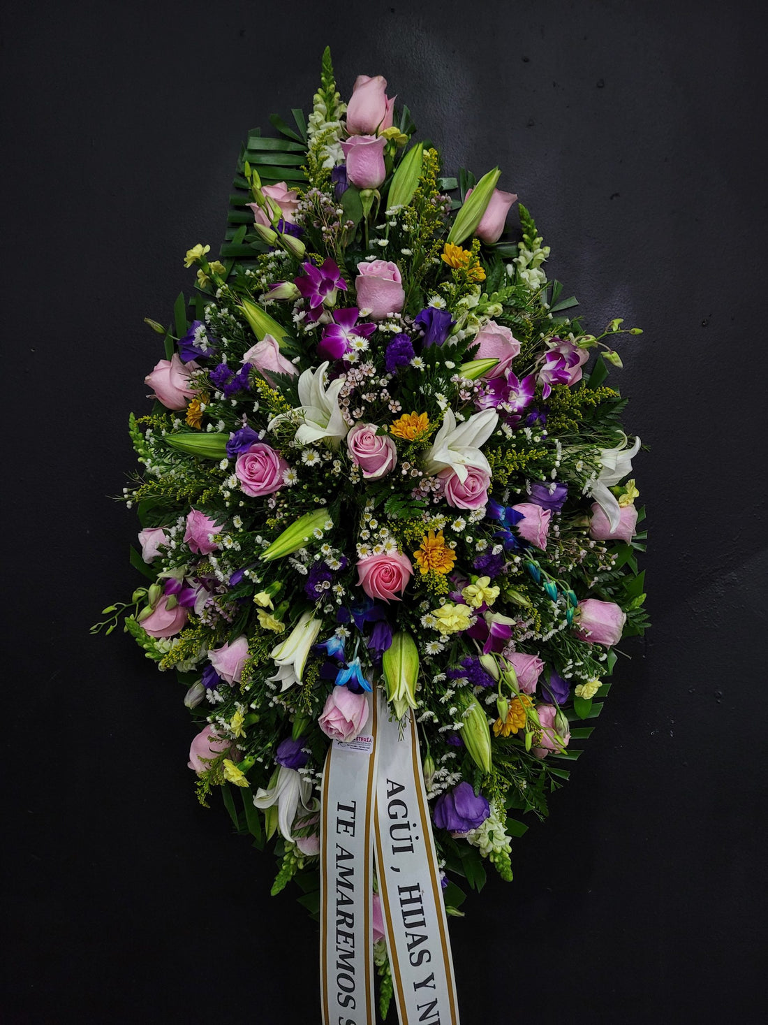 012 Corona Funeral Elegante acompañada de Rosas Azules, Lirios Casa Blanca, Masellanas